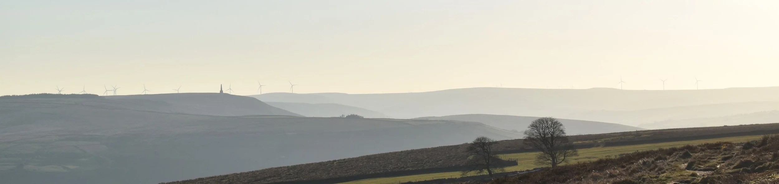 Photo of hills, fading into the the distance, with wind turbines and a monument silhouetted. there are two trees in the lower foreground.